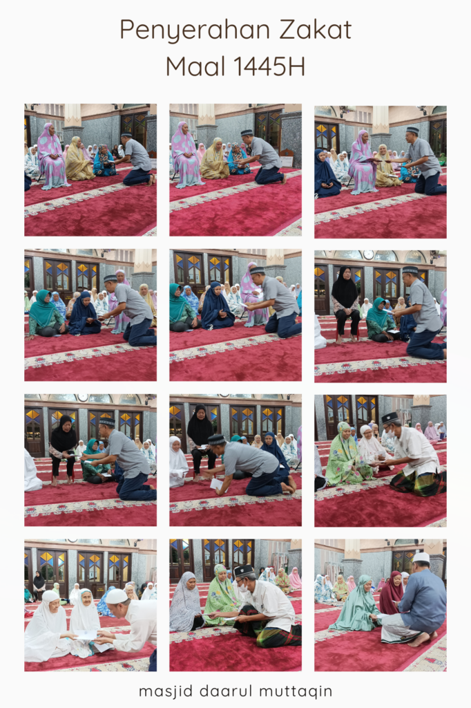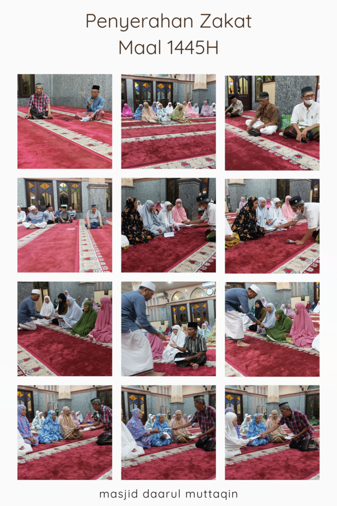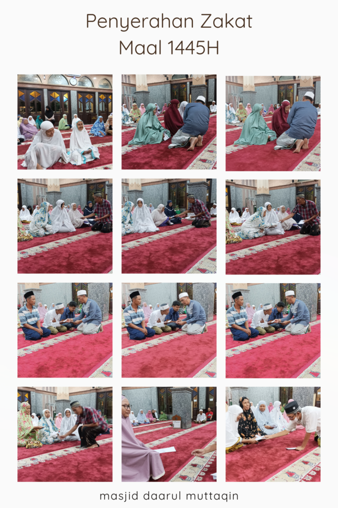 Pada hari Selasa malam (14/05/2024), di Masjid Daarul Muttaqin telah dilaksanakan kegiatan shalat Isya secara berjamaah dilanjutkan dengan penyerahan zakat maal yang telah berhasil dihimpun UPZ DM di tahun 1445H ini. Kegiatan ini bagian dari bentuk pertanggungjawaban kepada para muzzaki yang telah mempercayakan penyaluran zakatnya melalui Masjid Daarul Muttaqin.