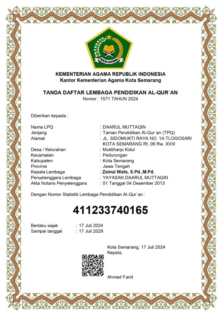 Alhamdulillah atas ijin allah swt, perpanjangan ijin Taman Pendidikan Al-Quran ( TPQ ) Daarul Muttaqin telah diterbitkan dari Kantor Kementrian Agama kota Semarang.