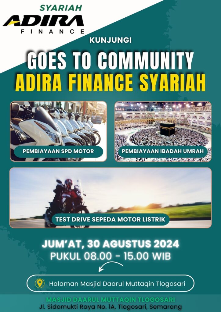 Adira Finance Syariah Cabang Semarang hadir di Halaman Masjid Daarul Muttaqin Tlogosari, Semarang, dengan tema Program Penuh Berkah di Adira Finance Syariah Goes to Community rencananya akan diadakan pada hari Jum’at, tanggal 30 Agustus 2024, mulai pukul 08.00 WIB pagi sampai dengan 15.00 WIB.