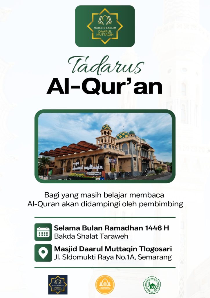 Dalam rangka menambah keimanan selama bulan suci Ramadhan 1446H, masjid Daarul Muttaqin Tlogosari yang beralamat di Jalan Sidomukti Raya no. 1A, Tlogosari, Kota Semarang, mengundang Jamaah masjid untuk mengikuti kegiatan Tadarus Al-Quran yang akan diselenggarakan pada: