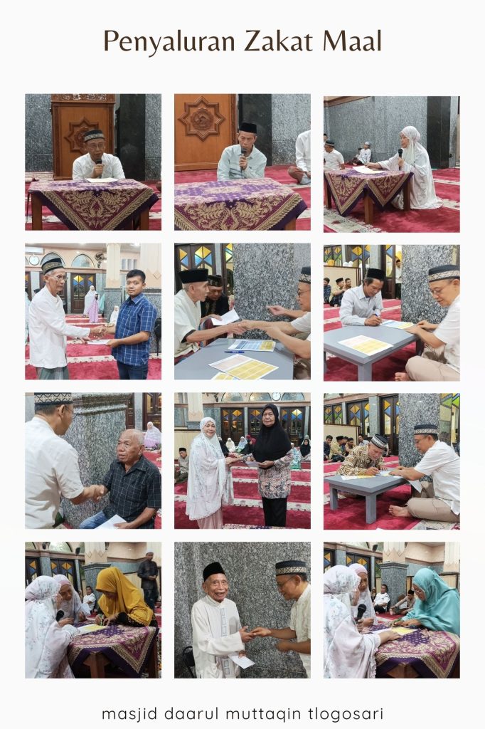 Acara dimulai dengan sambutan dari Ketua Yayasan Masjid Daarul Muttaqin, Bapak H Restu Dewadji, dilanjutkan sambutan oleh ketua unit UPZ Masjid Daarul Muttaqin, Bapak H Wagino Sunarto, yang menyampaikan rasa syukur dan apresiasi kepada para muzakki, para dermawan yang telah menunaikan kewajiban zakat maal mereka melalui masjid. Penyaluran ini merupakan bagian dari komitmen Masjid Daarul Muttaqin Tlogosari untuk tidak hanya menjadi tempat ibadah, tetapi juga pusat kepedulian sosial di tengah masyarakat. Dan Terakhir pembacaan doa dipimpin oleh Bapak H Hartono Ahmad.